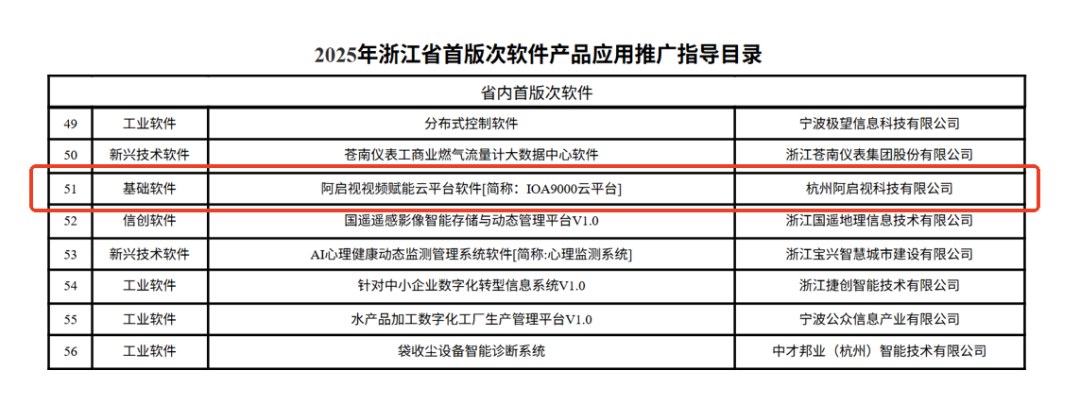 近日,浙江省经济和信息化厅、杭州市经济和信息化局正式公布了2025年度首版次软件产品认定名单。阿启视科技自主研发的“阿启视视频赋能云平台软件【简称:IOA9000云平台】”,凭借其创新性、技术领先性和应用高价值,成功入选省、市两级“首版次软件产品”。这是继2024年跻身国内首版次软件产品目录后,取得的又一里程碑式突破,标志着阿启视产品在技术领先性、市场竞争力方面实现了持续跃升。