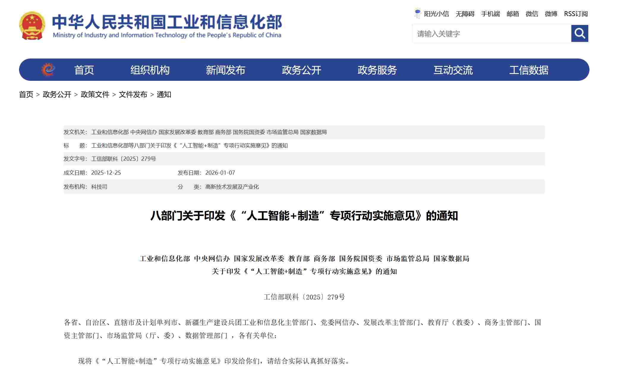 人工智能加速与实体经济深度融合,深刻改变制造业生产模式和经济形态,成为驱动产业升级、重塑全球格局的关键变量。为贯彻落实《关于深入实施“人工智能+”行动的意见》,加快推进人工智能技术在制造业融合应用,打造新质生产力,全方位、深层次、高水平赋能新型工业化,2026年1月7日,工业和信息化部、中央网信办、国家发展改革委等八部门印发本实施意见。