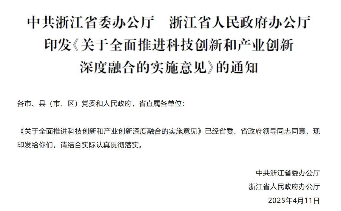 为深入贯彻习近平总书记考察浙江重要讲话精神,加快建设创新浙江因地制宜发展新质生产力,4月11日,中共浙江省委办公厅、浙江省人民政府办公厅就全面推进科技创新和产业创新深度融合提出如下实施意见。