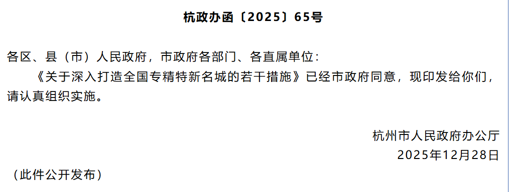为深入贯彻落实国家和省关于促进专精特新中小企业高质量发展的部署要求,加快科技创新和产业创新深度融合,深入打造全国专精特新名城,杭州市人民政府办公厅结合杭州市实际,于12月28日印发本措施。