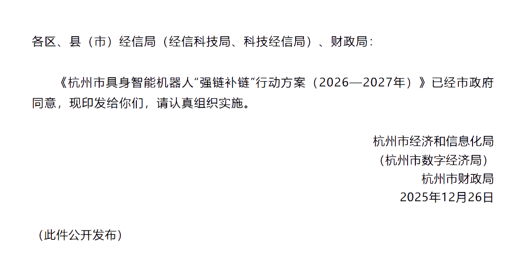 为深入贯彻《国务院关于深入实施“人工智能+”行动的意见》和国务院办公厅关于加快人形机器人产业创新发展工作部署,落实工业和信息化部和省、市有关文件精神,以人形机器人为创新引领,促进人工智能和先进制造融合,带动具身智能机器人产业快速发展,培育面向未来的经济增长新引擎,打造科技创新和产品创新融合发展典范,杭州市经济和信息化局和杭州市财政局于12月26日制定杭州市具身智能机器人“强链补链”行动方案。