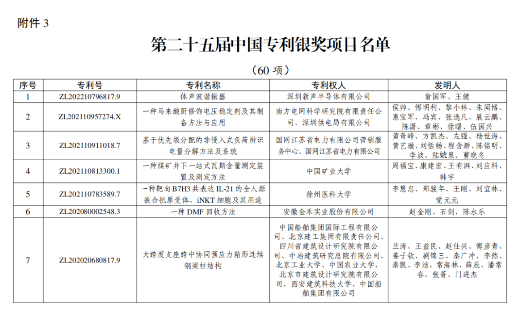 第二十五届中国专利银奖项目名单(部分)