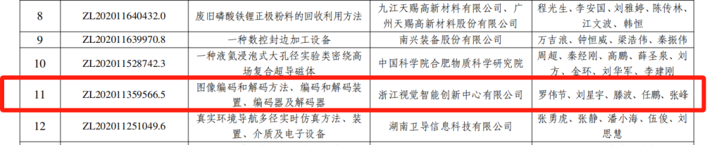 6月5日,《国家知识产权局关于第二十五届中国专利奖授奖的决定》公布,浙江视觉智能创新中心有限公司的发明专利《图像编码和解码方法、编码和解码装置、编码器及解码器》(专利号ZL202011359566.5)获中国专利银奖。