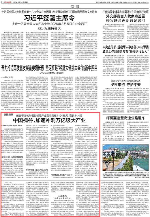 12月28日,《浙江日报》02要闻版刊登《中国视谷,加速冲刺万亿级大产业》报道。“中国视谷”通过“一园窗口、双核引领”的协同机制,形成滨江研发与萧山智造联动的发展格局,三年间依托30亿元产业基金吸引13个重点项目落地,窗口园区规上工业总产值年均增长28.7%。目前产业链已集聚海康威视、先临三维等领军企业,覆盖数字安防、工业视觉、智能网联汽车等领域,不仅推动杭州构建“296X”先进制造业集群体系,更为打造全国人工智能创新发展第一城提供关键支撑。