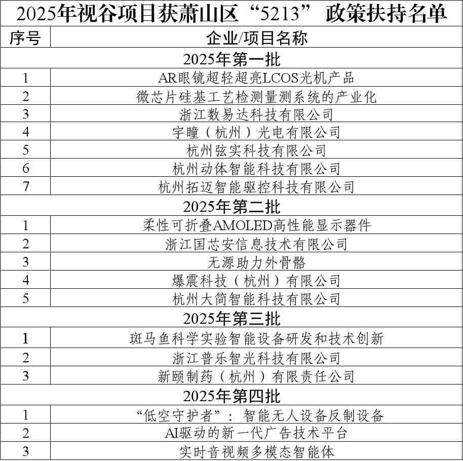 2. 2025年多个视谷项目获萧山区“5213”政策扶持
