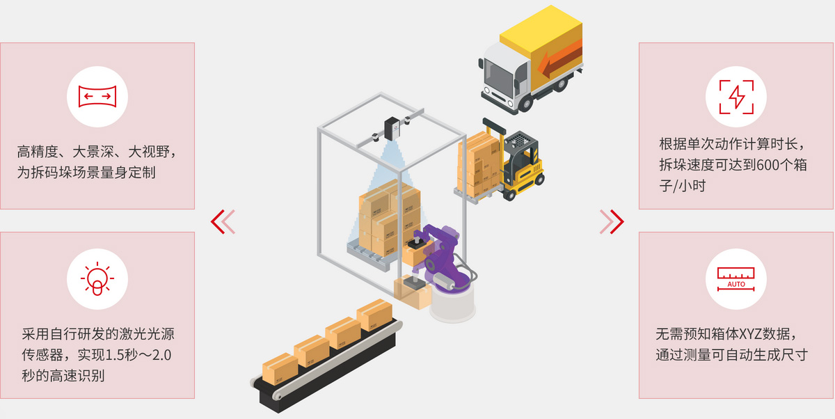 以面向工厂自动化开发的视觉识别与智能化技术为基础,研制具备视觉与智能技术的机器人,助力物流行业全面转型,提供面向物流一体化的解决方案。基于3D机器视觉的TVS高精度机械臂控制引导系统与机械臂配合,构成独立拆垛设备,可自动识别万种以上尺寸的箱体,实现高节拍智能化拆垛、快速部署、长时间稳定工作,推动劳动密集型向技术密集型转型,从根本上改变产品的工业生产和物流模式。